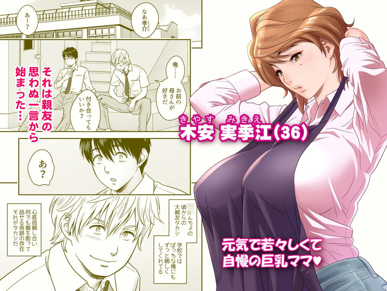 一人息子を立派な学生にまで育てたシングルマザー。36歳。年齢より若く見える。母子家庭で苦労も多かったが、持ち前の明るさとバイタリティで乗り越えて来た。比較的スレンダーな体つきに不釣り合いな巨大なオッパイを持つ。孝介の友達や周囲の大人の男達からの性的な視線に曝されるのが常だが、本人は意に介していない様に見える。孝介と特に親しくしてくれているタカシには深く感謝していて、息子同様に親しく接してきた。